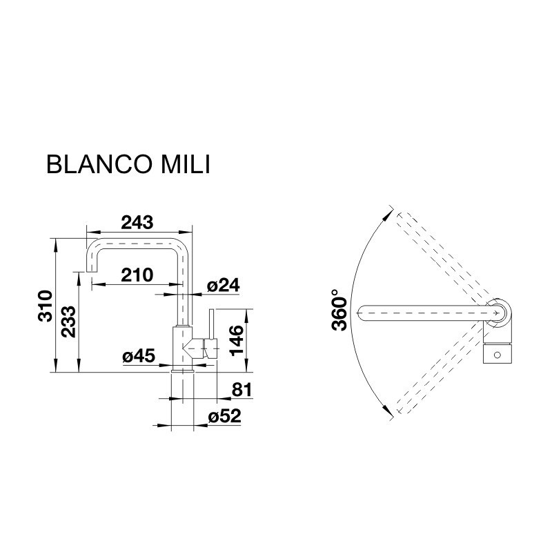 - загальна висота змішувача 310 мм, поворотнийвилив360°: висота 233 мм, довжина 243 мм