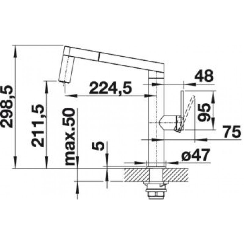 - загальна висота змішувача 298.5 мм, поворотний вилив 160°: висота 211.5 мм, довжина 224.5 мм