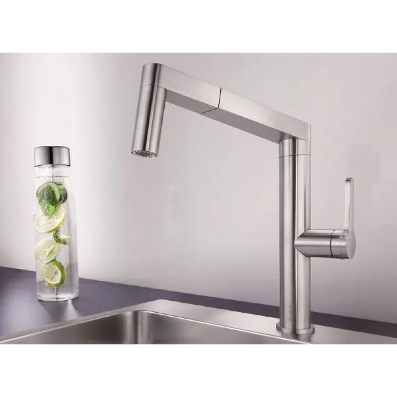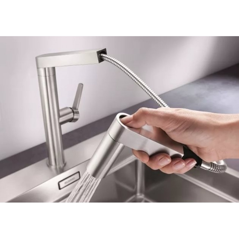 - інноваційна концепція управління висувного шланга, перемикання струмінь/душ одним натисканням кнопки, ідеальна інтеграція кнопки душа