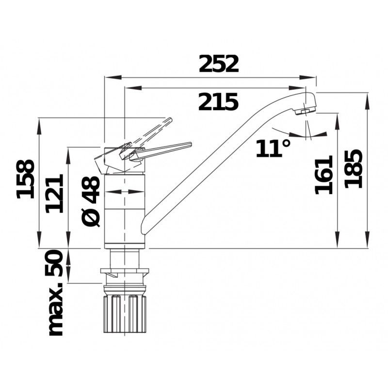 - загальна висота змішувача 185 мм, поворотнийвилив 180°: висота 161 мм, довжина 252 мм