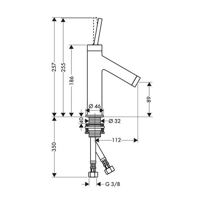 - Загальна висота змішувача 257 мм, литий вилив: висота 89 мм, довжина 112 мм