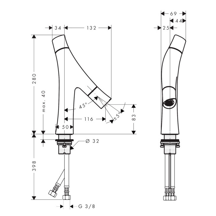 - Загальна висота змішувача 280 мм, литий вилив: висота 83 мм, довжина 116 мм