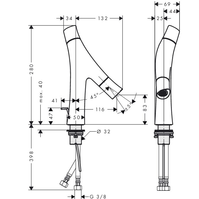- Загальна висота змішувача 280 мм, литий вилив: висота 83 мм, довжина 116 мм