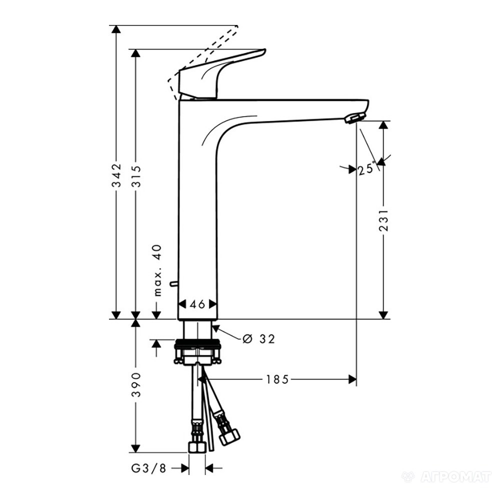 - Загальна висота 315/342 мм, Г-вилив: висота 231 мм, довжина 185 мм
