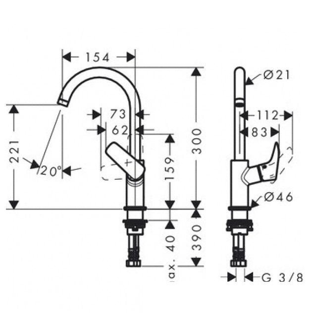 - Загальна висота змішувача 300 мм, поворотний вилив на 120°: висота 221 мм, довжина 154 мм