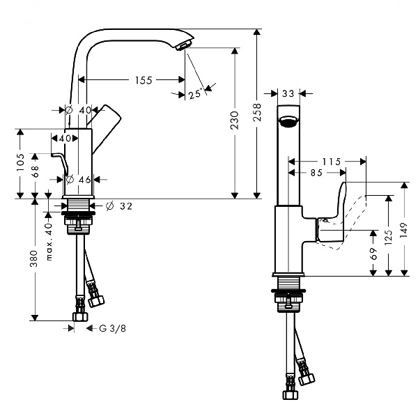 - Загальна висота 258 мм, поворотний вилив: висота 230 мм, довжина 155 мм