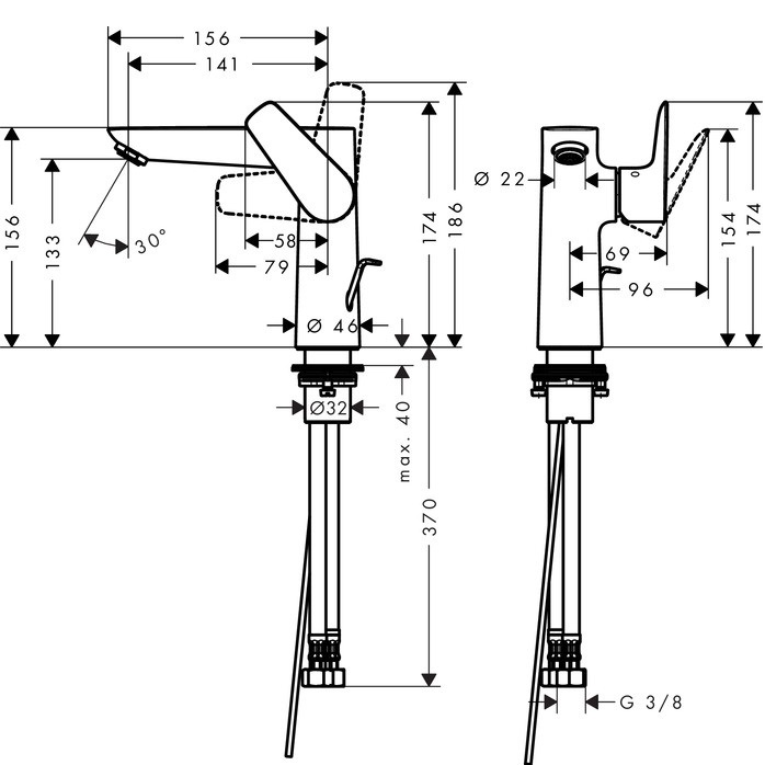 - Загальна висота змішувача 174/186 мм, литий вилив: висота 155 мм, довжина 141 мм, бічний важіль