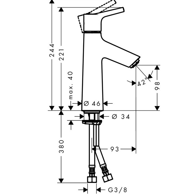 - Загальна висота змішувача 221/244 мм, литий вилив: висота 98 мм, довжина 93 мм