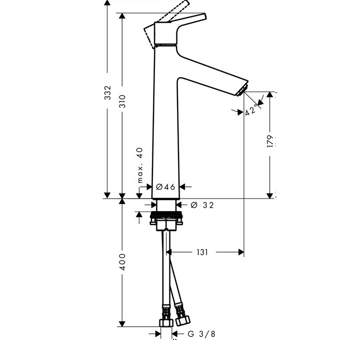 - Загальна висота змішувача 310/332 мм, литий вилив: висота 179 мм, довжина 131 мм