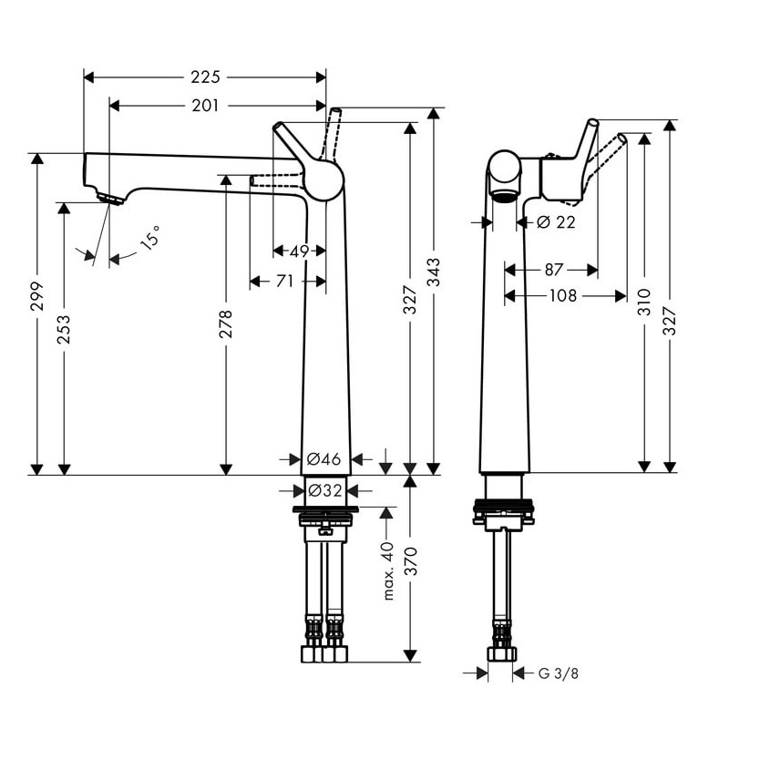 - Загальна висота змішувача 327/343 мм, литий вилив: висота 253 мм, довжина 201 мм
