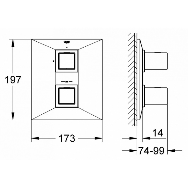 - Із запірним вентилем, керамічні вентилі 1/2" 180°, вбудований обмежувач температури при макс. 50°C, аквадиммер багатофункціональний: регулювання витрати, рукоятка витрати з економічною кнопкою та індивідуально встановлюваним стопором