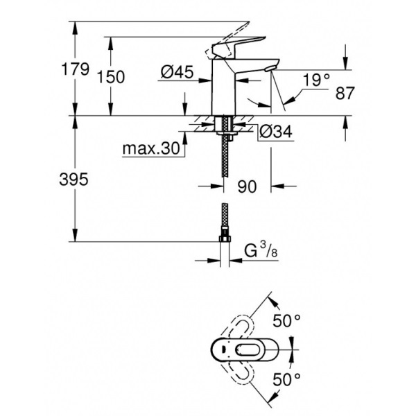 - Загальна висота 150/179 мм, литий вилив: висота 87 мм, довжина 90 мм