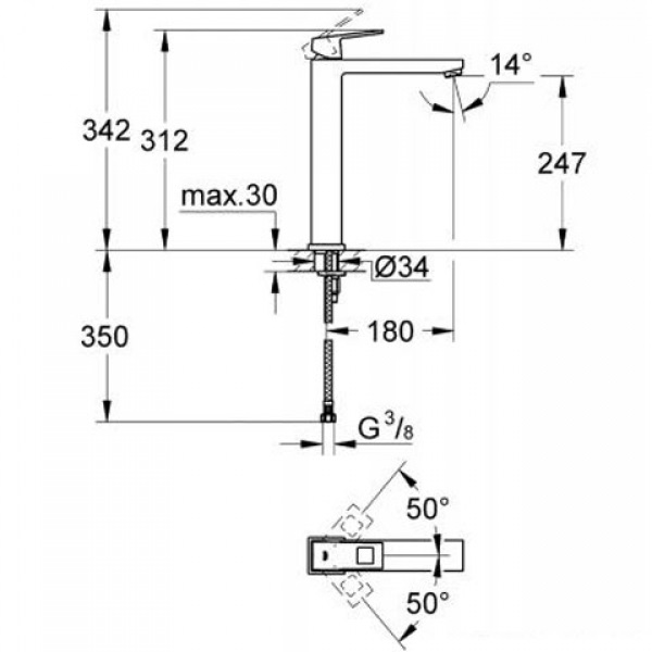 - Загальна висота 312/342 мм, литий вилив: висота 247 мм, довжина 180 мм