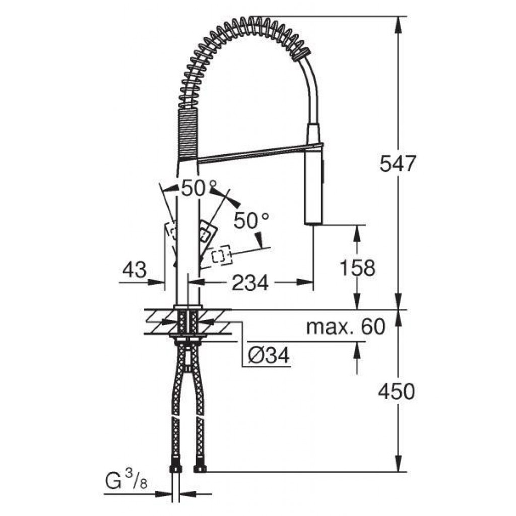 - Загальна висота 547 мм, поворотний вилив на 140°, кронштейн із кутом повороту 360°, автоматичний перемикач аератор/SpeedClean душовий струмінь