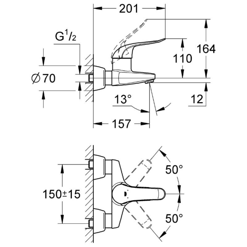 - Настінний монтаж, литий вилив з виносом 157 мм