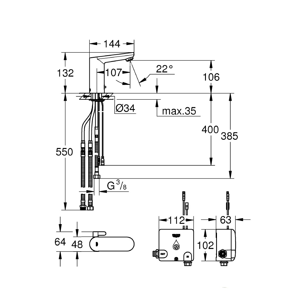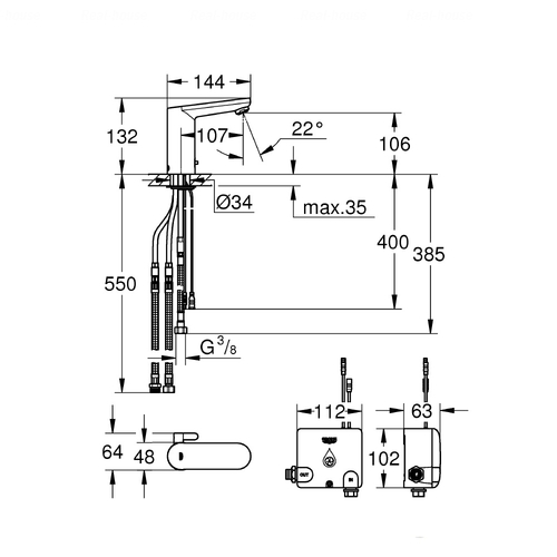 - Вбудований обмежувач витрати води 6 л/хв., з вбудованим електромагнітним клапаном, змішувальний пристрій зі стопором гарячої води, брудоуловлювальні фільтри, зворотний клапан, аератор 5.7 л/хв.