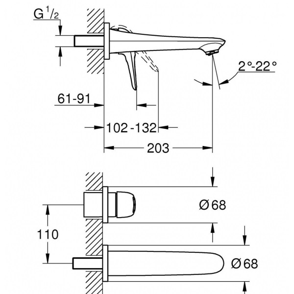 - Настінний монтаж, литий вилив з виносом 203 мм, розмір по осях 110 мм, аератор регульований