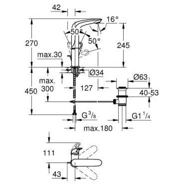 - Загальна висота 270 мм, поворотний вилив: висота 245 мм, довжина 127 мм