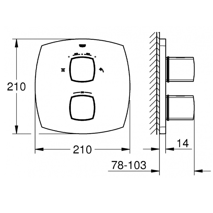 - Корпус латунь 210 х 210 мм, колір - хром або хром-золото, металеві рукоятки
