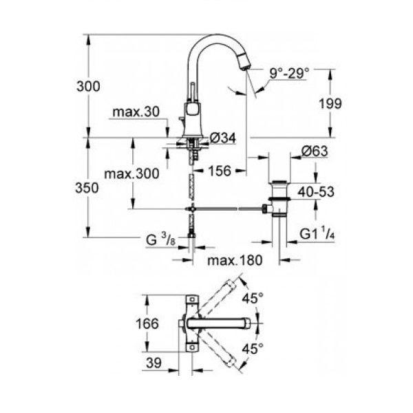- Загальна висота 158/190 мм, поворотний вилив: висота 83 мм, довжина 109 мм, керамічні вентилі, для гарячої та холодної води 1/2" поворот 90°