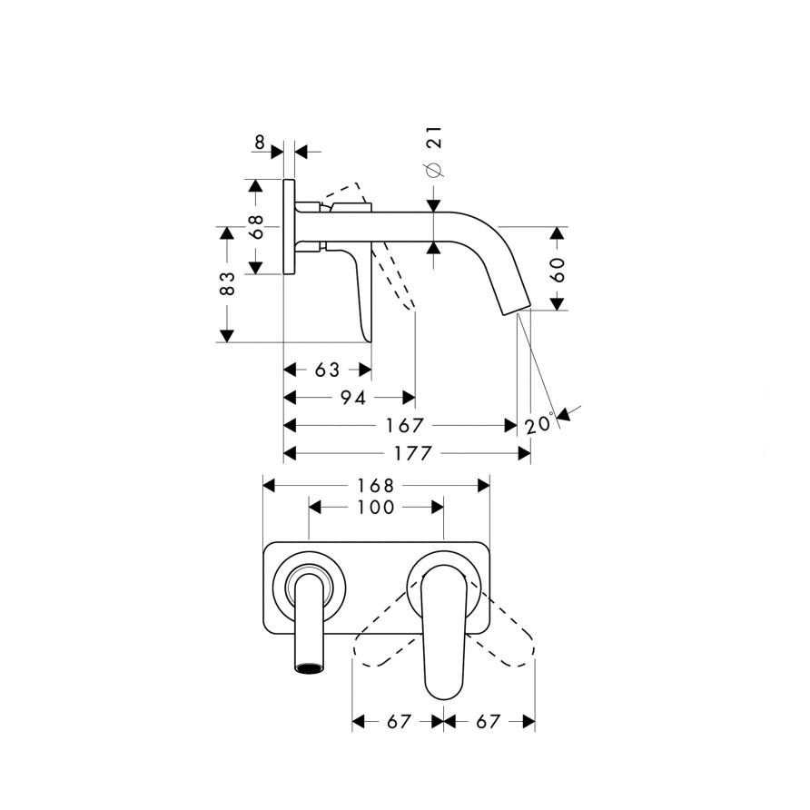 - Настінний монтаж, розмір пластини 168 х 68 мм, литий вилив: виступ 167 або 227 мм, з можливістю розміщення рукоятки праворуч або ліворуч