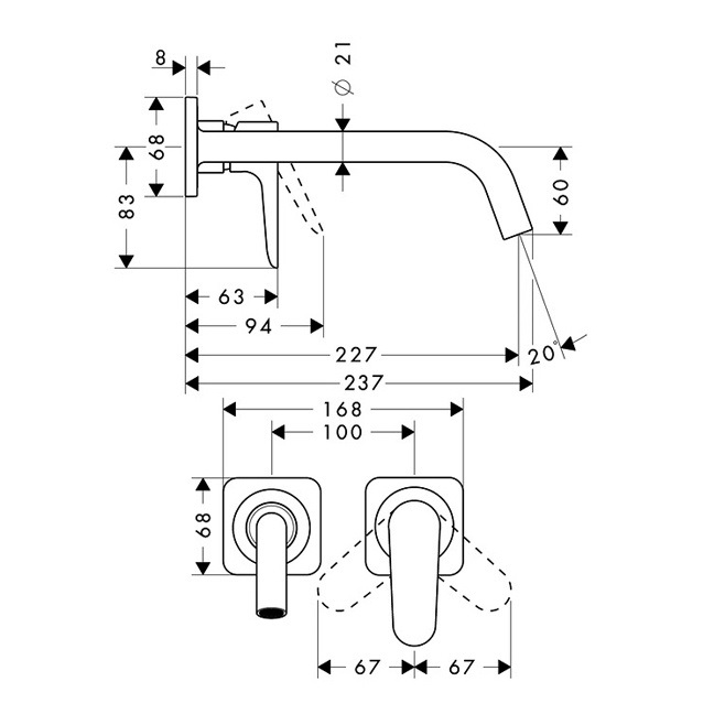 - Настінний монтаж, розмір пластини 168 х 68 мм, литий вилив: виступ 167 або 227 мм, з можливістю розміщення рукоятки праворуч або ліворуч