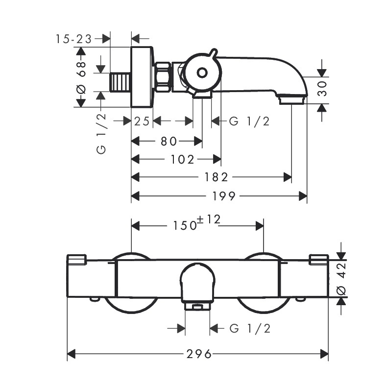 - Настінна установка на 2 отвори, міжосьове підключення 150 мм ± 12 мм, витрата води 22 л/хв.