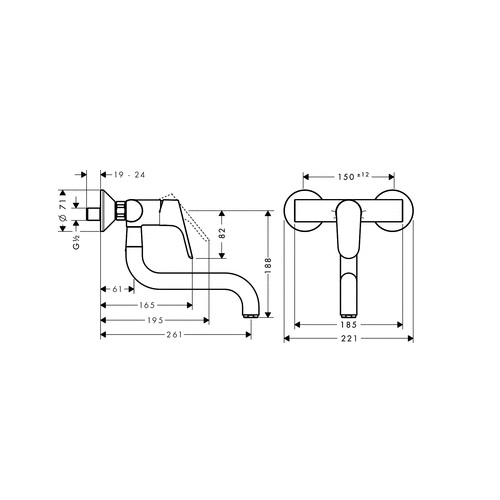 - Настінне підключення на 2 отвори, S-подібні ексцентрики, міжосьове підключення 150 мм ± 12 мм