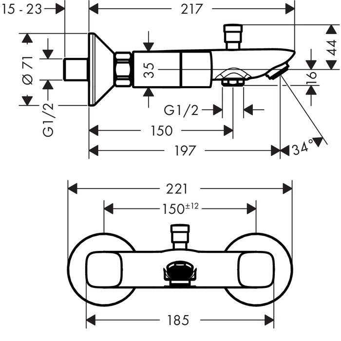 - Настінна установка на 2 отвори, міжосьове підключення: 150 мм ± 12 мм