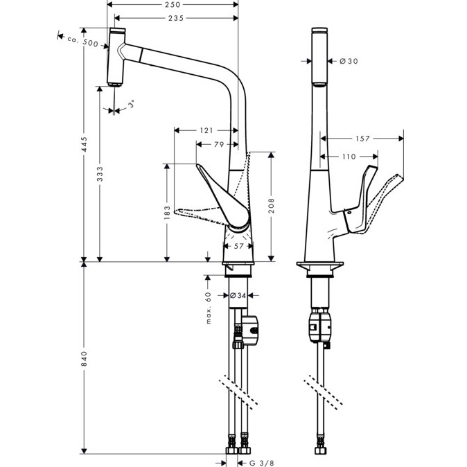 - Загальний розмір 445 мм, поворотний вилив на 110°, 150°: висота 333 мм, довжина 235 мм