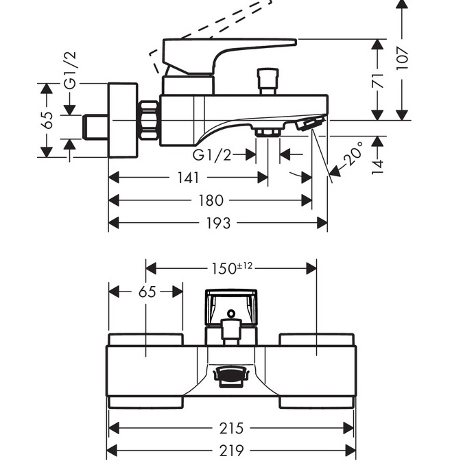- Настінна установка на 2 отвори, литий виливши з виносом 180 мм, автоматичний перемикач ванна/душ