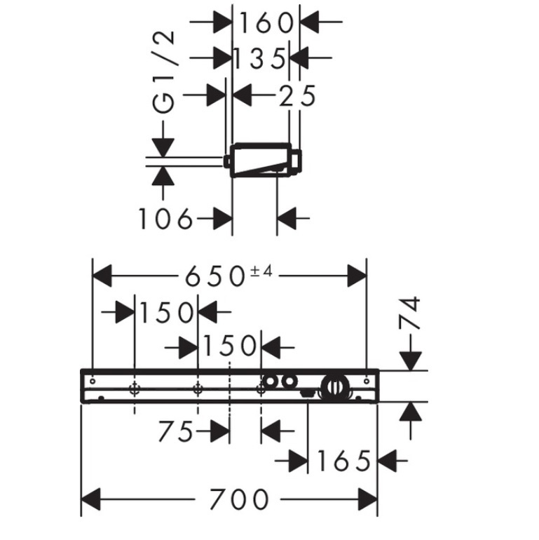 - Корпус - латунь, ручки - метал, колір - хром, загальні розміри 700 х 74 мм, скляна накладка на корпусі змішувача, колір хром або біла