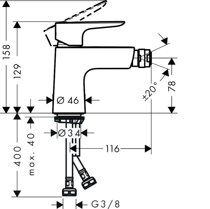 - Загальна висота 129/158 мм, литий вилив із шарнірним аератором: висота 78 мм, довжина 116 мм