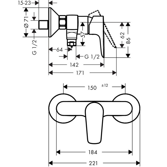 - Встановлення настінне на 2 отвори, міжосьове підключення: 150 мм ± 12 мм, S-подібні ексцентрики, лапан зворотного струму води