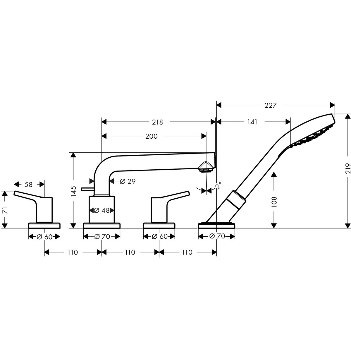 - Литий вилив: висота 108 мм, довжина 200 мм, душовий гарнітур: ручний душ Croma Select S 1jet (арт. 26804400) з витяжним шлангом 1100 мм, вбудований тримач душа