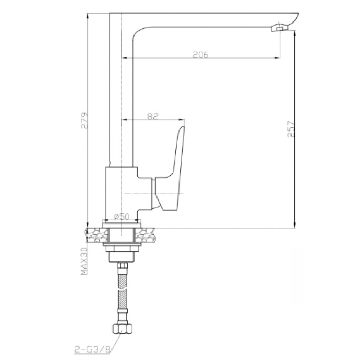 - загальна висота 279 мм, поворотний вилив: висота 257 мм, довжина 206 мм