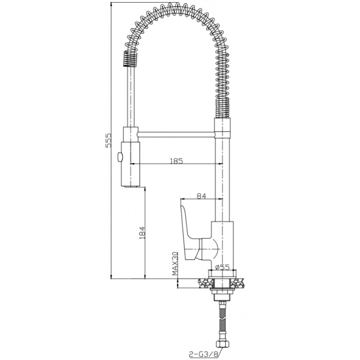 - загальна висота 555 мм, поворотний вилив: висота 184 мм, довжина 185 мм, двофункціональний вилив (нормальний струмінь і душ)