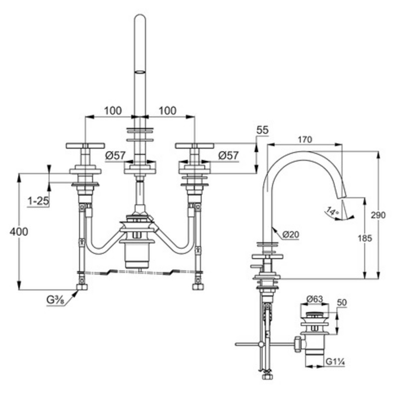 - донний клапан G 1 1/4 з металу, гнучке підведення G 3/8