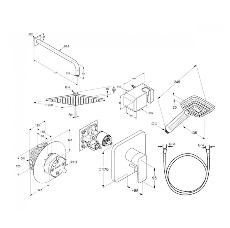 - лійка: 250х250 мм, підведення води 1/2, витрата води 9 л/хв., довжина кронштейна 427 мм