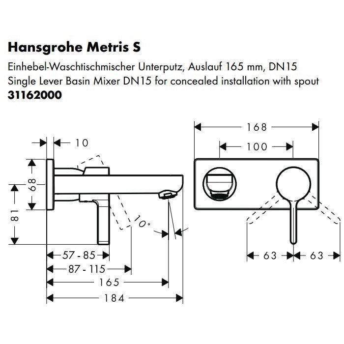 Змішувач настінний для раковини Hansgrohe Metris винос виливу 165 мм