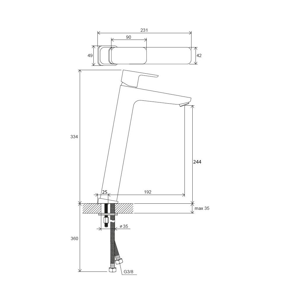 - змішувач: загальна висота 334 мм, вилив: висота 244 мм, довжина 192 мм