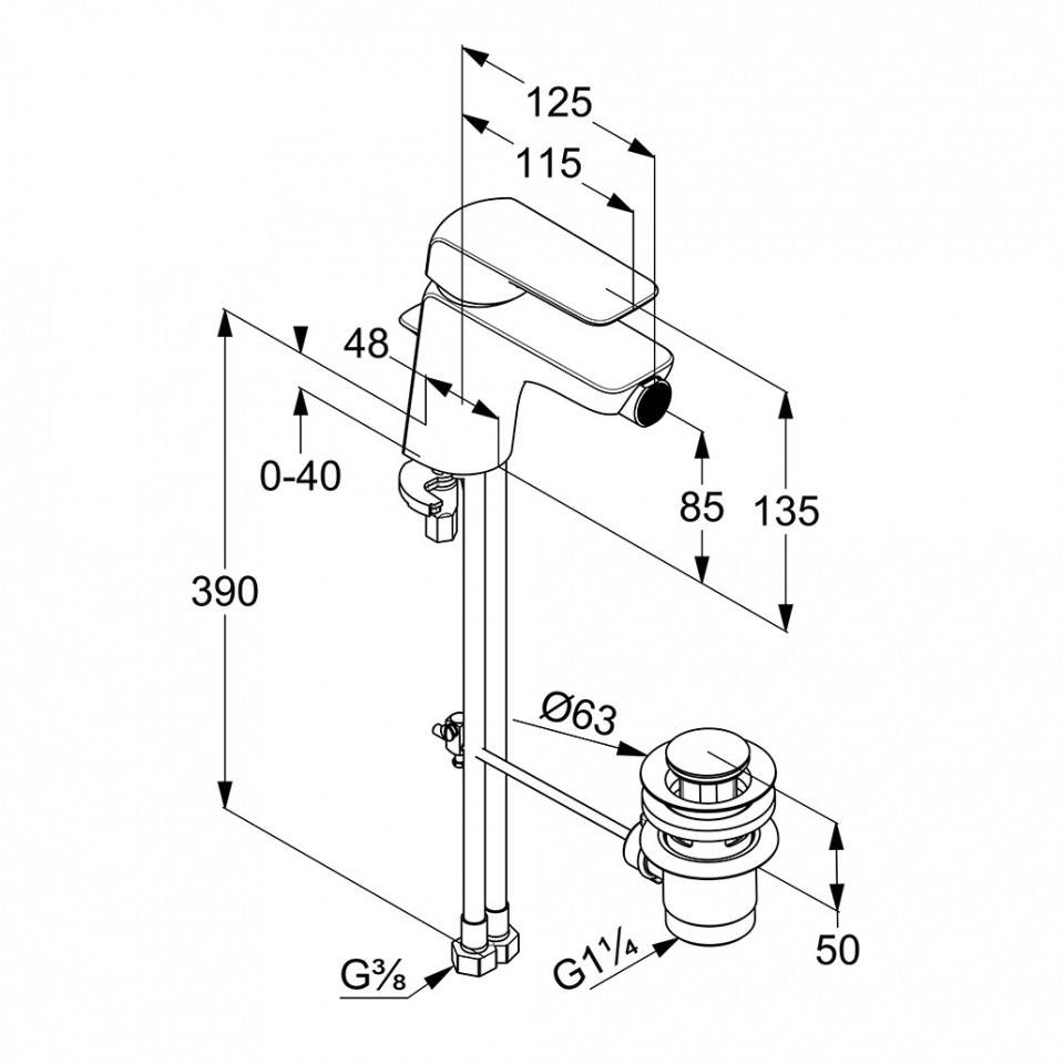 - витрата води 6 л/хв., Eco PCA s-pointer, аератор M 24x1, керамічний картридж, гнучка підводка G 3/8, донний клапан