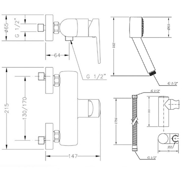 Змішувач для душу Genebre Klip 64110164566, з душовим гарнітуром.