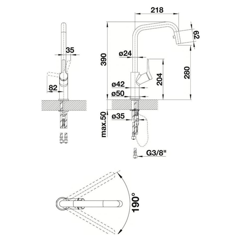 - загальна висота змішувача 390 мм, поворотний (на 190), висувнийвилив: висота 280 мм, довжина 218 мм