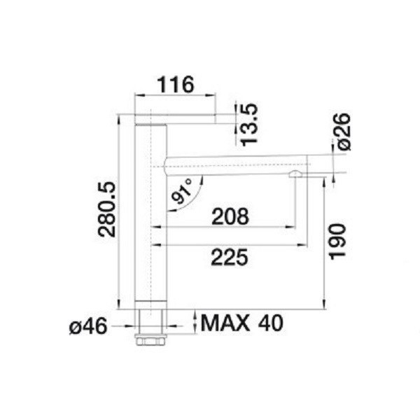 - загальна висота 281 мм, поворотний вилив 130°: висота 190 мм, довжина 225 мм,довжина рукоятки 116 мм