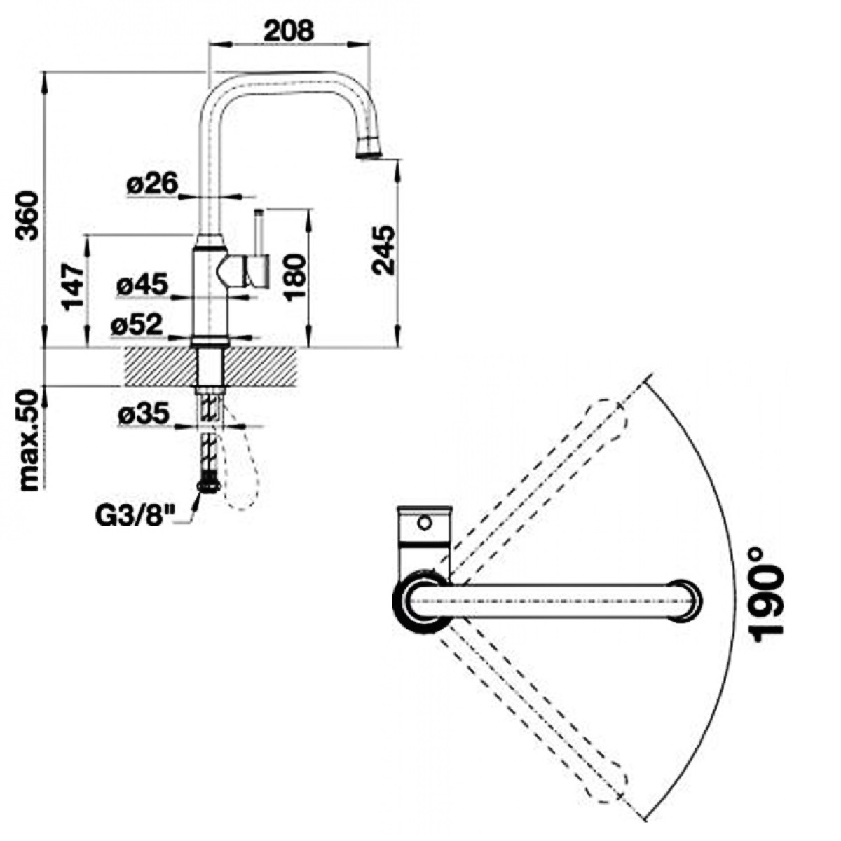 - загальна висота змішувача 360 мм, поворотнийвилив 190°: висота 245 мм, довжина 208 мм