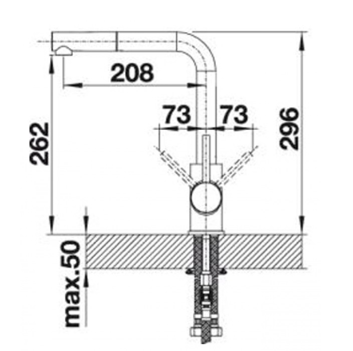 - загальна висота змішувача 296 мм, поворотний (на 360), висувнийвилив: висота 262 мм, довжина 208 мм