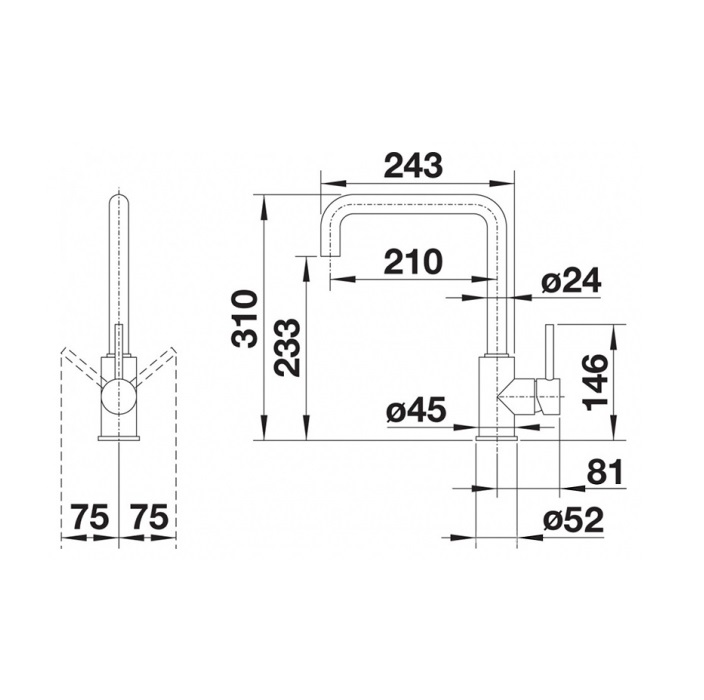 - загальна висота змішувача 310 мм, поворотнийвилив на 360: висота 233 мм, довжина 210 мм