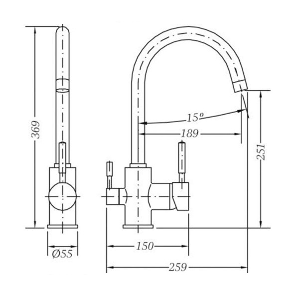 - - поворотний вилив 360°: висота 251 мм, довжина 189 мм, загальна висота 369 мм