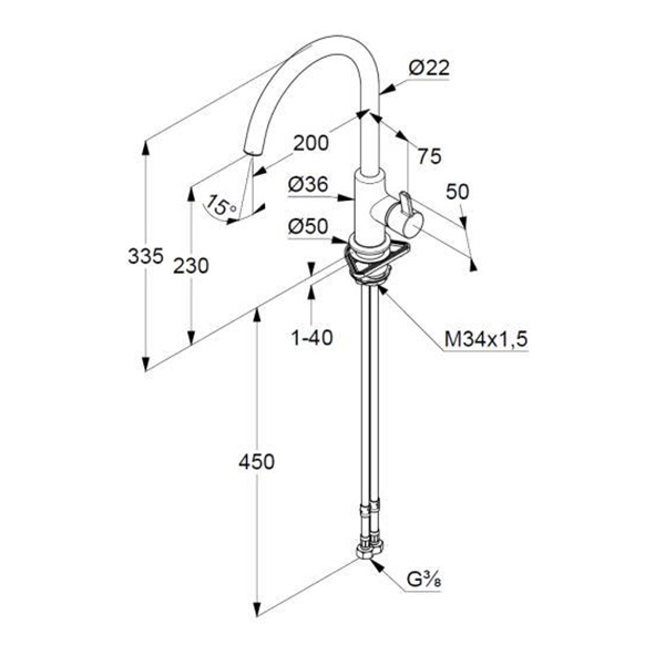 - загальна висота 335 мм, поворотний вилив на 360°: висота 230 мм, довжина 200 мм